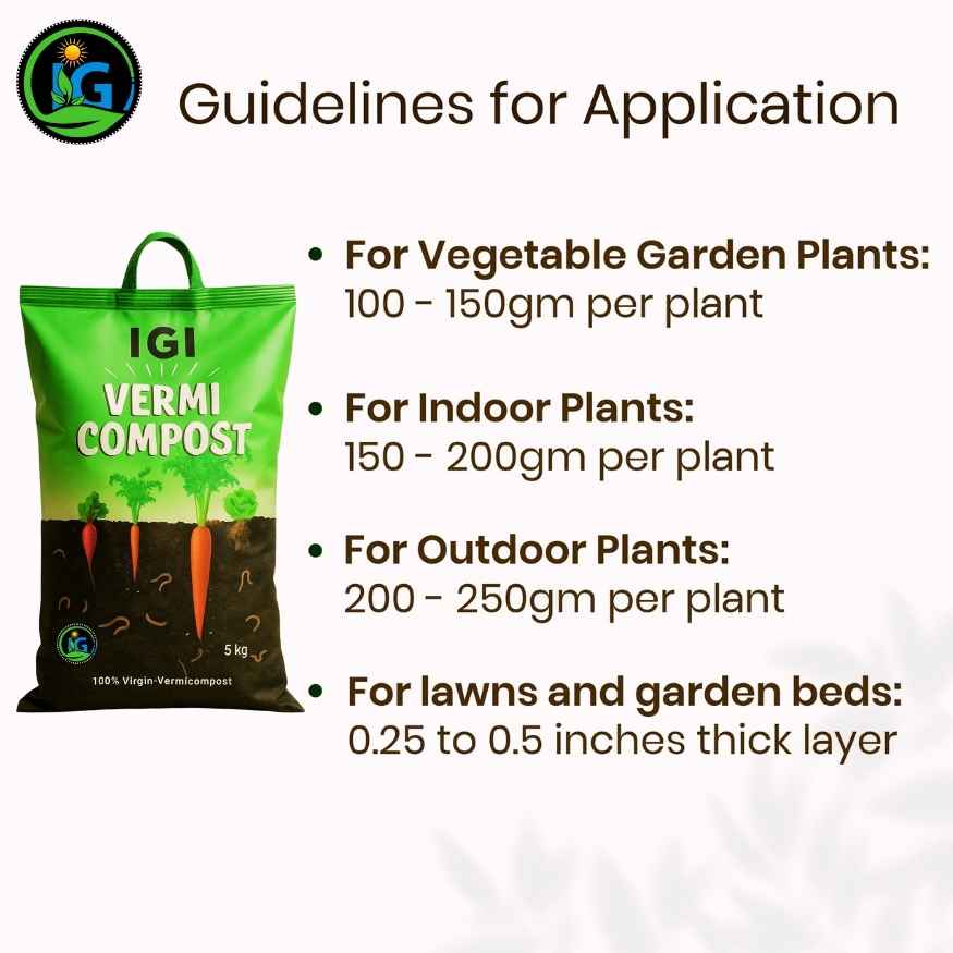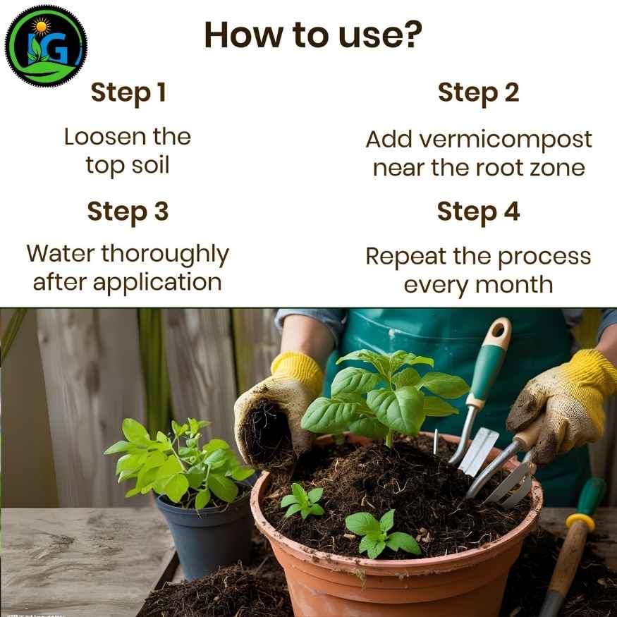 Add 200–300g vermicompost per 12-inch pot every 30–45 days.